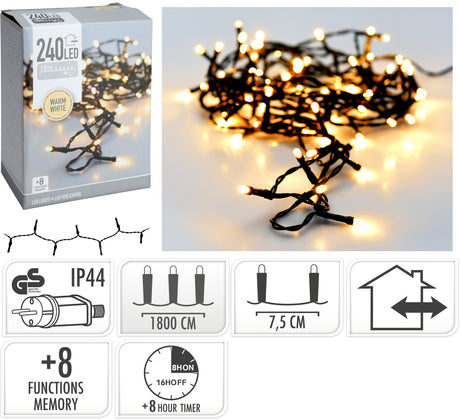 240 Led Χριστουγεννιάτικα Φωτάκια Θερμό Λευκό Φώς Πράσινο Καλώδιο 18m με Πρόγραμμα